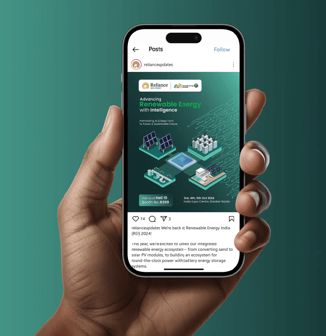 Created a unified visual system that seamlessly connected multiple product zones within the booth, highlighting innovation and sustainability. The design ensured brand consistency across physical and digital touchpoints, while pre-event social media built anticipation and positioned Reliance New Energy as a leader in the clean energy space.